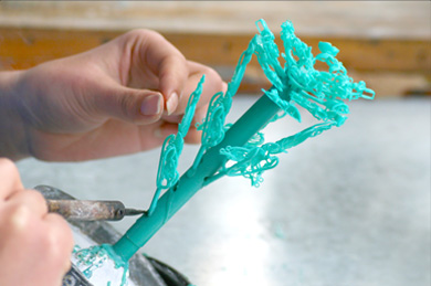 使用注蠟機注出蠟版,用修蠟刀、銼刀、砂紙和電烙鐵修整蠟版,使其無開模痕跡和其它缺陷,檢驗合格后將每個蠟版整齊地焊接到蠟棒上,種成蠟樹。