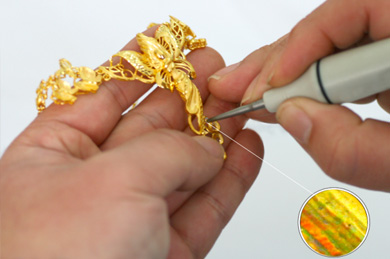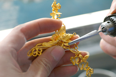將澆鑄出來的產品進行修整稱之為執模。執模包括整形、修挫、過砂、焊接、組裝等,全部用手工方式進行。執模就是將澆鑄出來的黃金產品修整到和原版一樣,需要技能 水平較高的工人用嫻熟的手法制作。